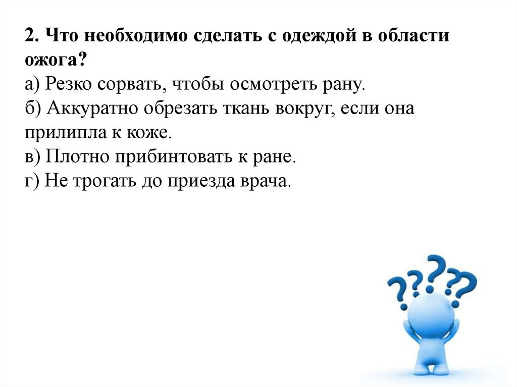2. Что необходимо сделать с одеждой в областиожога?