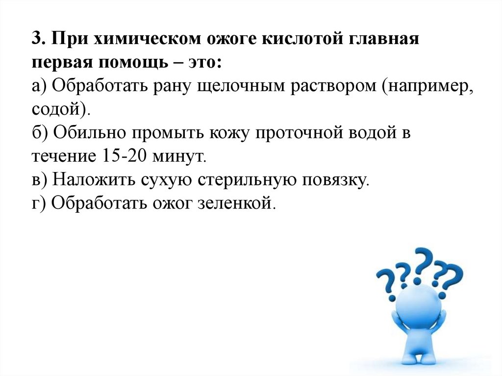 2. Химический ожог Б) Охладить место ожога проточной водой, накрыть