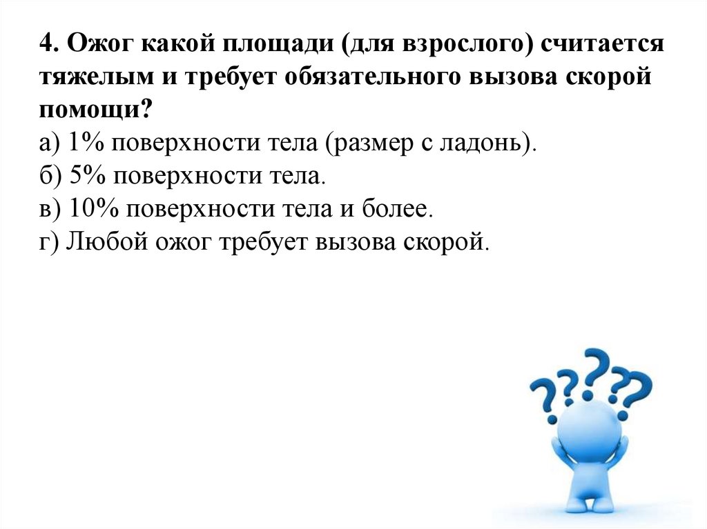 4. Ожог какой площади (для взрослого) считаетсятяжелым и требует обязательного вызова скорой