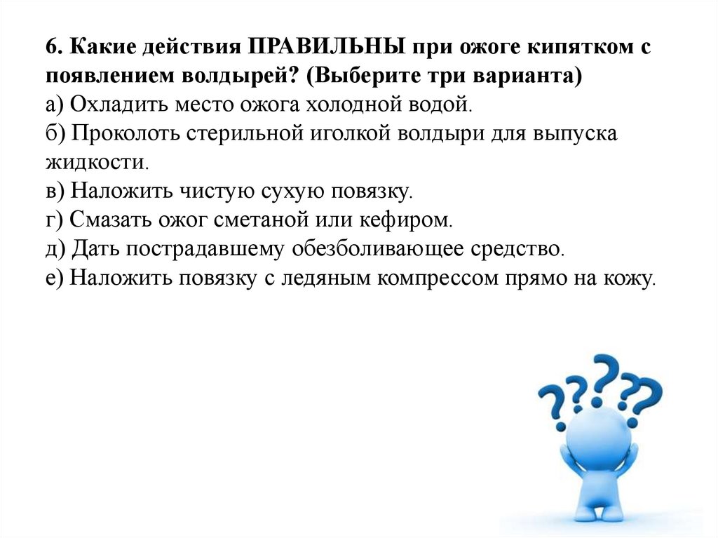 6. Какие действия ПРАВИЛЬНЫ при ожоге кипятком споявлением волдырей? (Выберите три варианта)