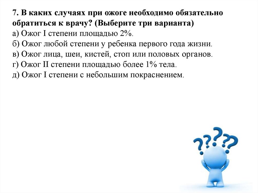 7. В каких случаях при ожоге необходимо обязательнообратиться к врачу? (Выберите три варианта)