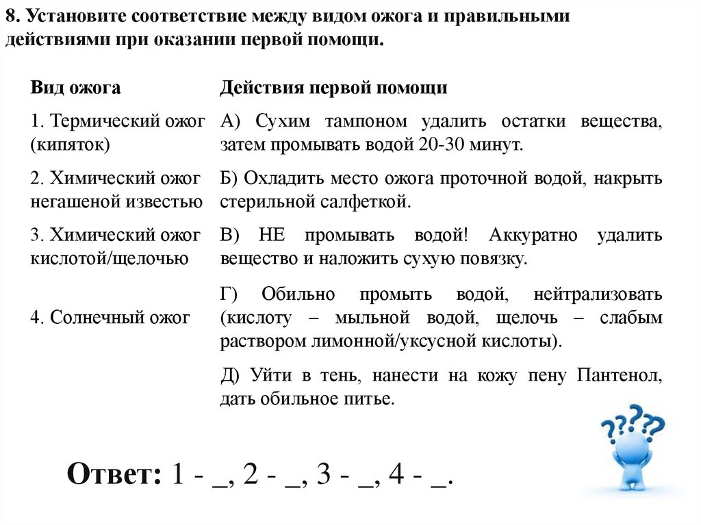 8. Установите соответствие между видом ожога и правильнымидействиями при оказании первой помощи.