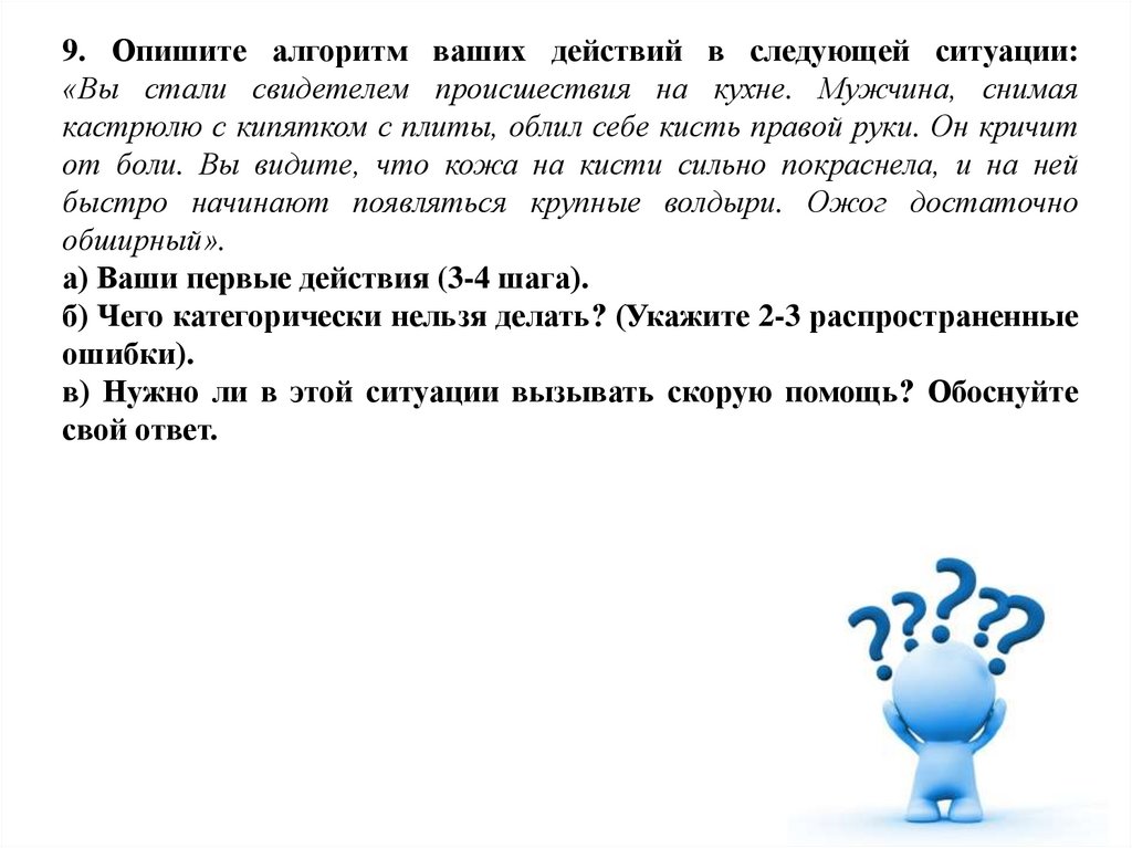 9. Опишите алгоритм ваших действий в следующей ситуации:«Вы стали свидетелем происшествия на кухне. Мужчина, снимая