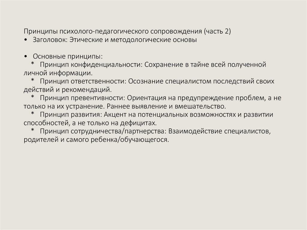 Принципы психолого-педагогического сопровождения (часть 2)• Заголовок: Этические и методологические основы