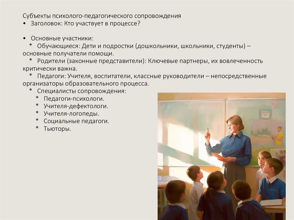 Субъекты психолого-педагогического сопровождения• Заголовок: Кто участвует в процессе?