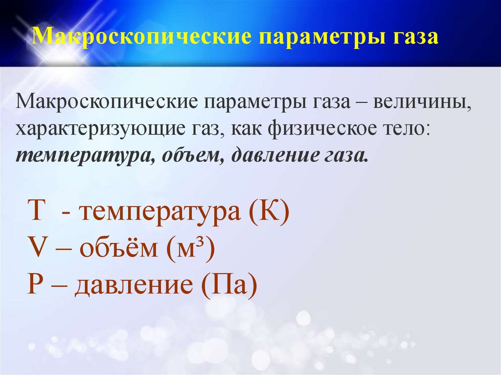 Макроскопические параметры газаМакроскопические параметры газа – величины,