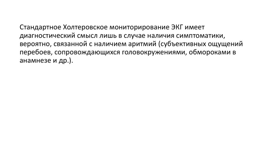 Стандартное Холтеровское мониторирование ЭКГ имеетдиагностический смысл лишь в случае наличия симптоматики,