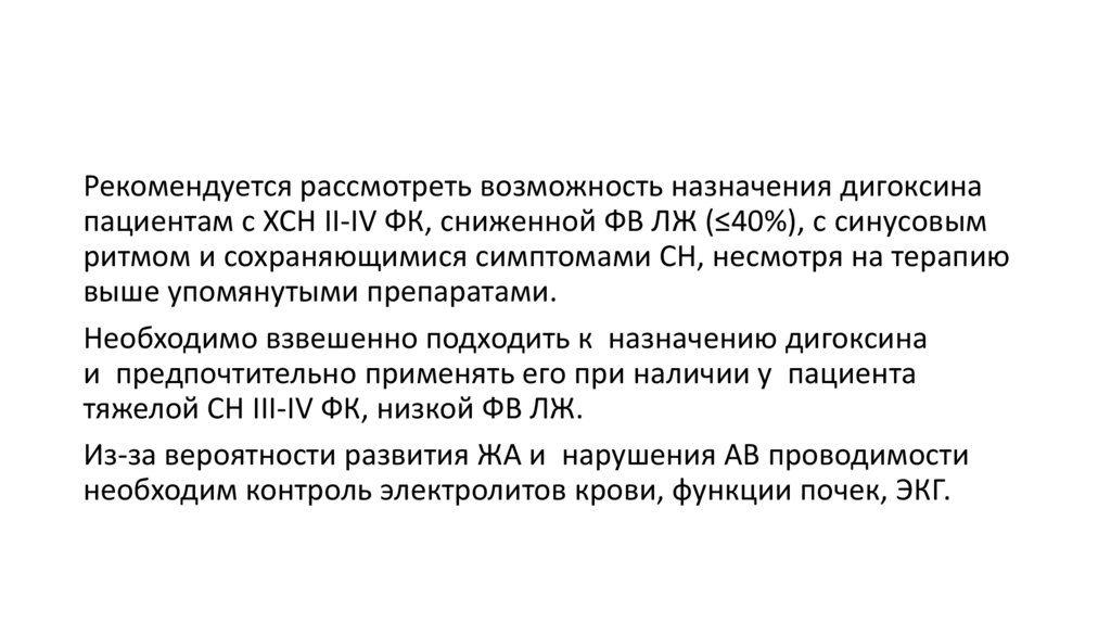Рекомендуется рассмотреть возможность назначения дигоксинапациентам с ХСН II-IV ФК, сниженной ФВ ЛЖ (≤40%), с синусовым