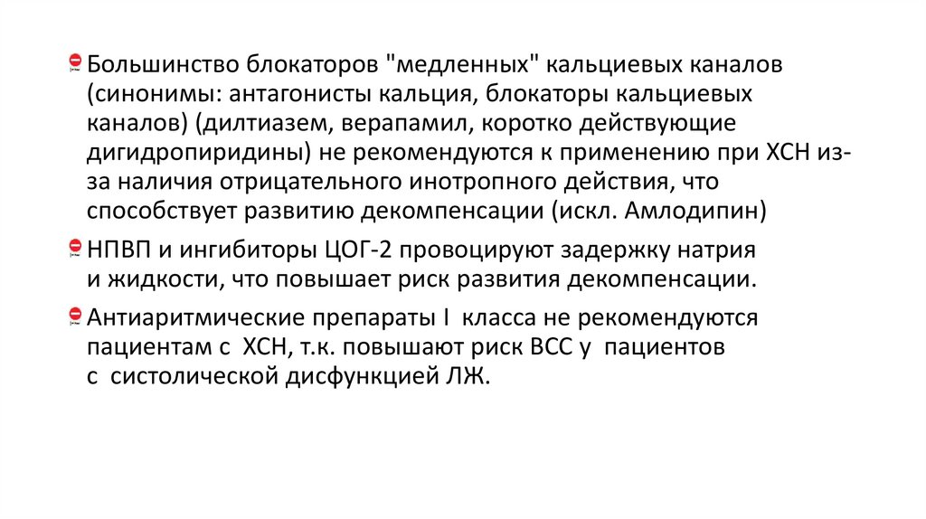 дигидропиридины) не рекомендуются к применению при ХСН изза наличия отрицательного инотропного действия, что