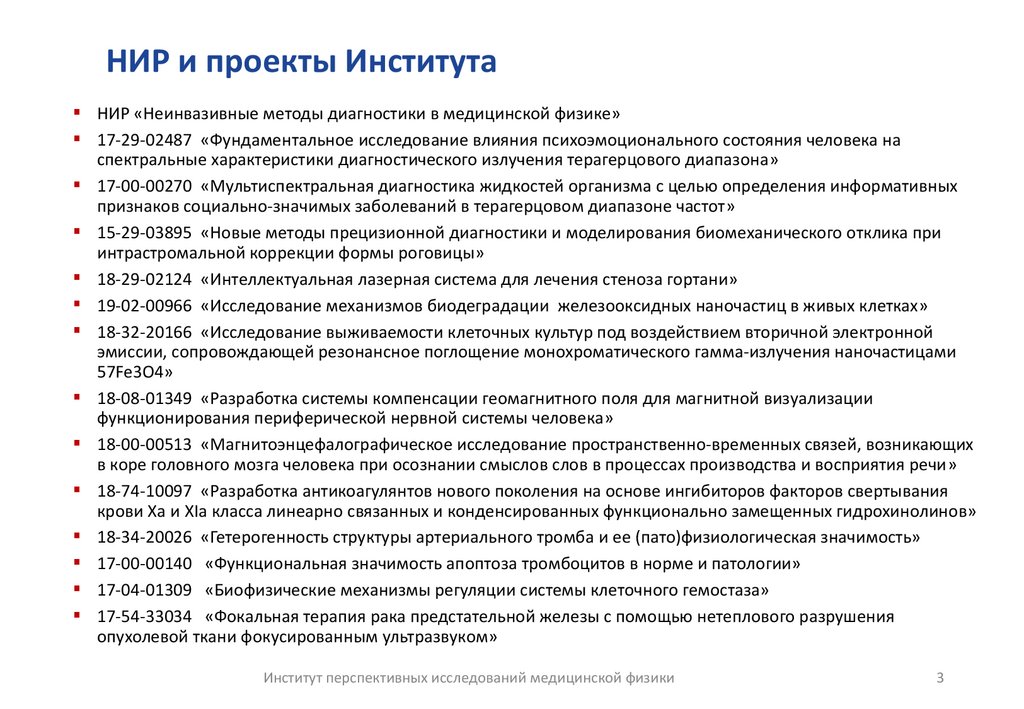 НИР и проекты ИнститутаНИР «Неинвазивные методы диагностики в медицинской физике»