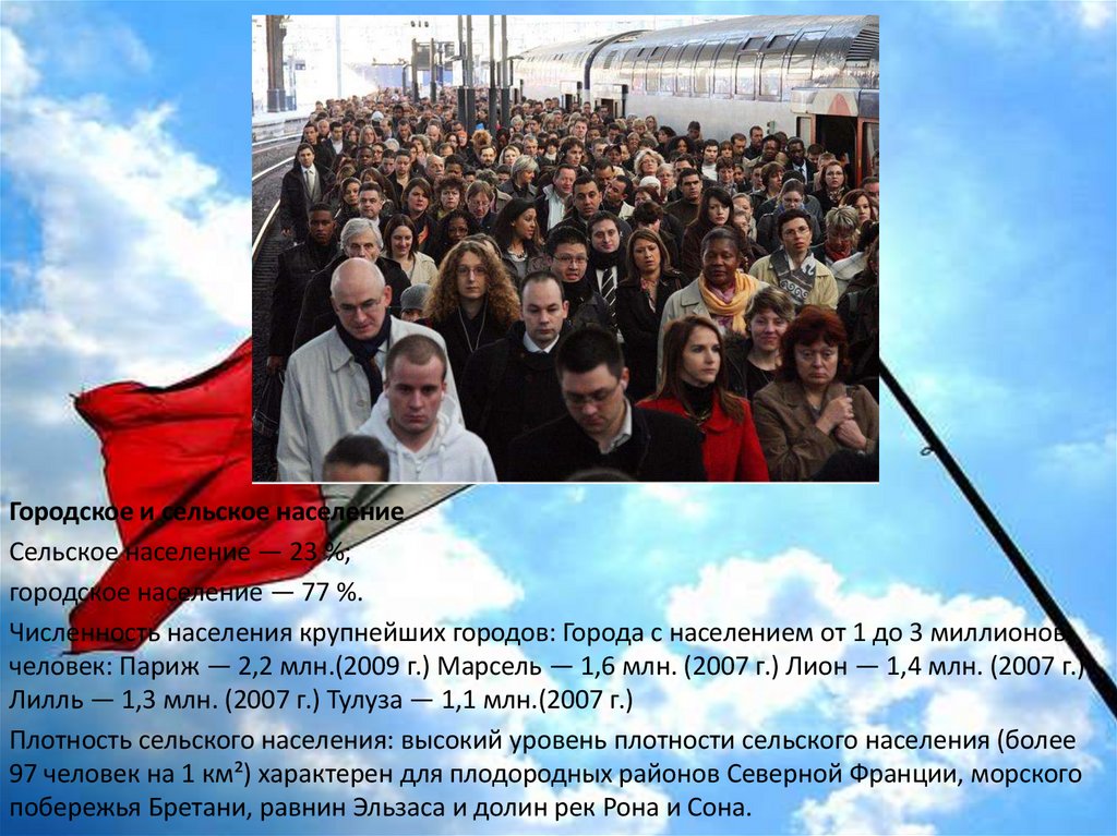 человек: Париж — 2,2 млн.(2009 г.) Марсель — 1,6 млн. (2007 г.) Лион — 1,4 млн. (2007 г.)