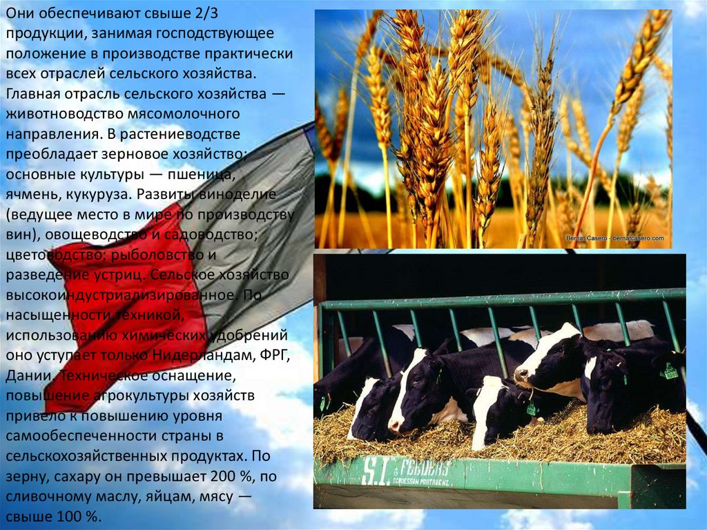 Франция — один из крупнейших в Европе производителей сельскохозяйственнойпродукции, занимает одно из ведущих мест в мире по поголовью крупного рогатого скота,