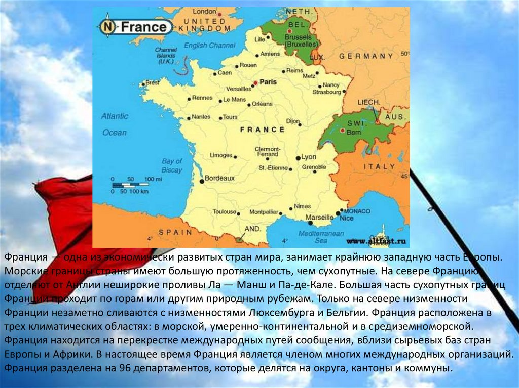 Франция — одна из экономически развитых стран мира, занимает крайнюю западную часть Европы.Морские границы страны имеют большую протяженность, чем сухопутные. На севере Францию