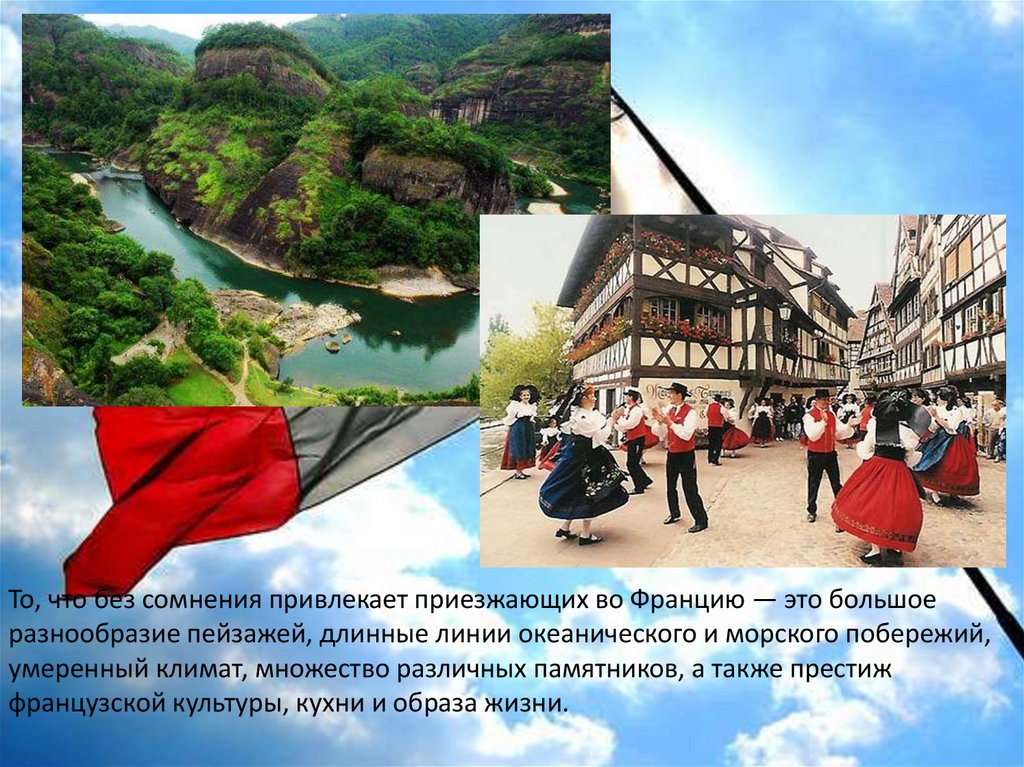 То, что без сомнения привлекает приезжающих во Францию — это большоеразнообразие пейзажей, длинные линии океанического и морского побережий,