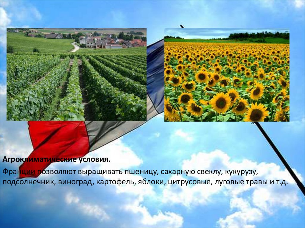 Агроклиматические условия.Франции позволяют выращивать пшеницу, сахарную свеклу, кукурузу,