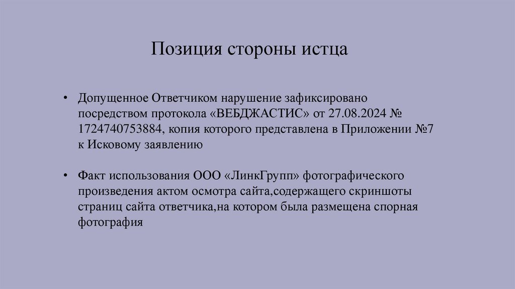 Позиция стороны истца• Допущенное Ответчиком нарушение зафиксировано