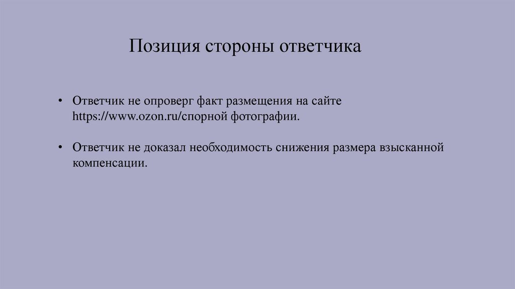 Позиция стороны ответчика• Ответчик не опроверг факт размещения на сайте