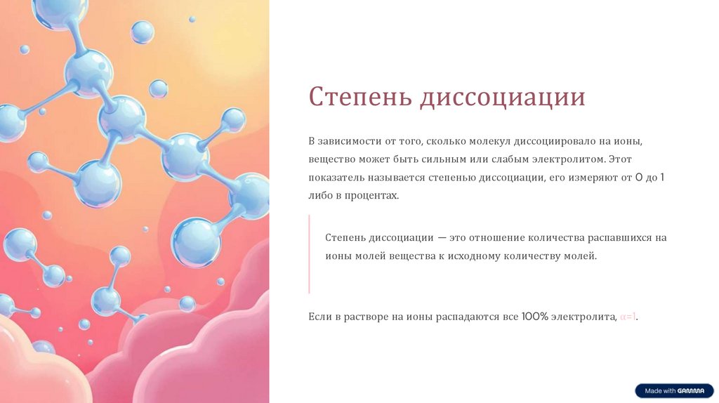 Степень диссоциацииВ зависимости от того, сколько молекул диссоциировало на ионы,