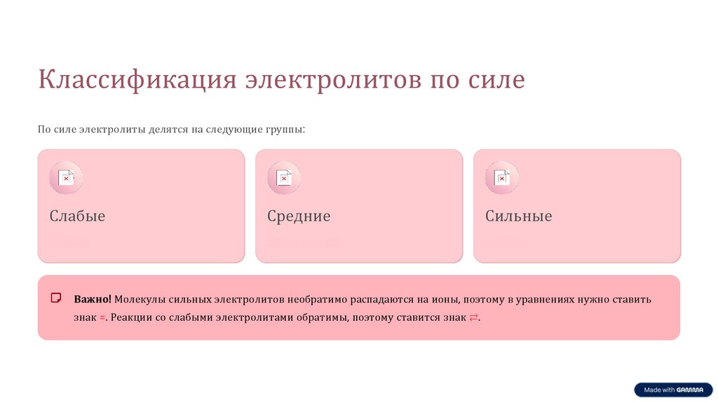 Классификация электролитов по силеПо силе электролиты делятся на следующие группы: