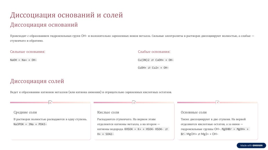 Происходит с образованием гидроксильных групп OH- и положительно заряженных ионов металла. Сильные электролиты в растворах диссоциируют полностью, а слабые —