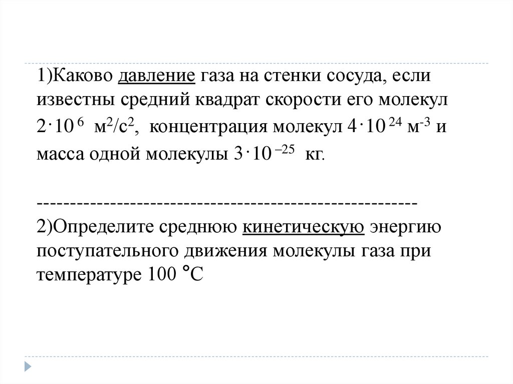 1)Каково давление газа на стенки сосуда, еслиизвестны средний квадрат скорости его молекул