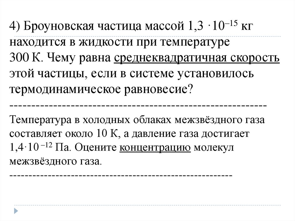 4) Броуновская частица массой 1,3 ·10–15 кгнаходится в жидкости при температуре