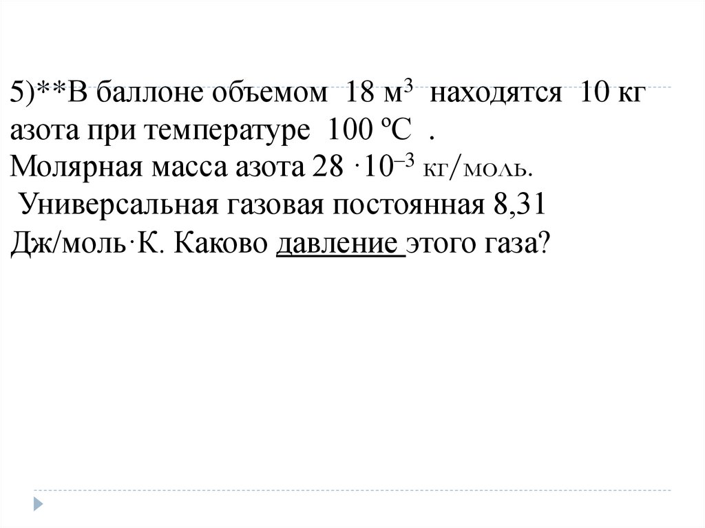 5)**В баллоне объемом 18 м3 находятся 10 кгазота при температуре 100 ºС .
