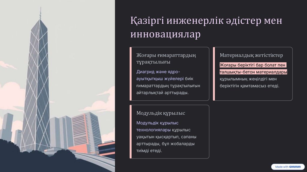 Қазіргі заманғы жобаларда инновациялық материалдар мен әдістердің енгізілуі құрылыс сапасын арттырады.