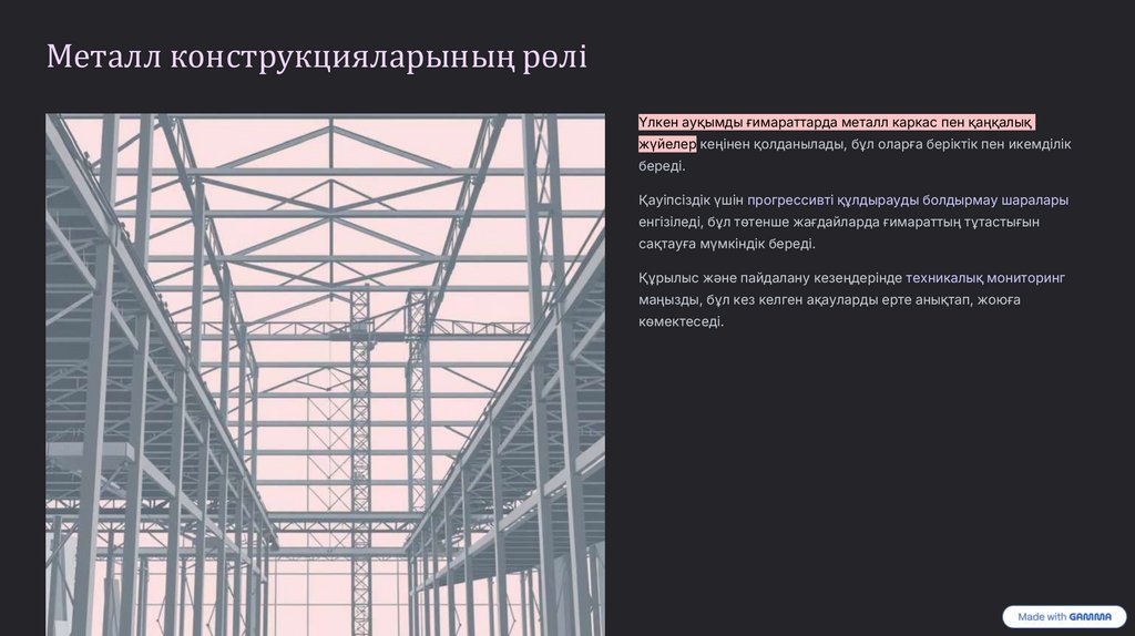 Металл конструкцияларының рөліҮлкен ауқымды ғимараттарда металл каркас пен қаңқалық
