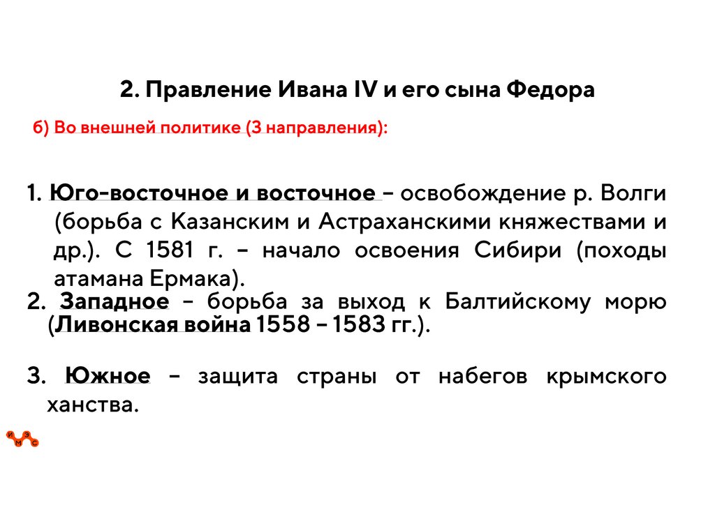 2. Правление Ивана IV и его сына Федораб) Во внешней политике (3 направления):
