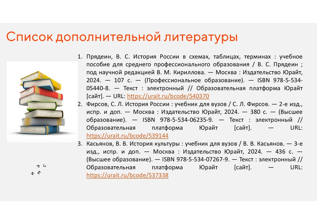 Список дополнительной литературы1. Прядеин, В. С. История России в схемах, таблицах, терминах : учебное