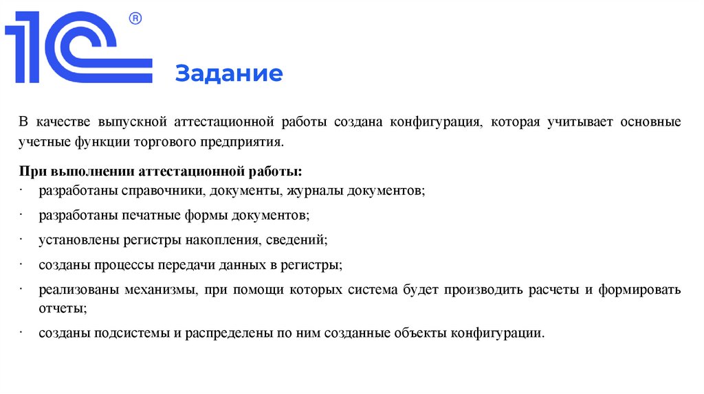 ЗаданиеВ качестве выпускной аттестационной работы создана конфигурация, которая учитывает основные