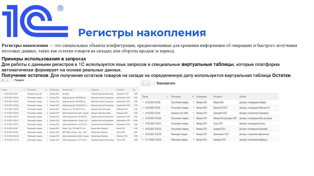 Для работы с данными регистров в 1С используется язык запросов и специальные виртуальные таблицы, которые платформа