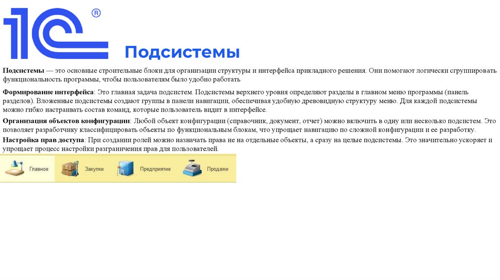 разделов). Вложенные подсистемы создают группы в панели навигации, обеспечивая удобную древовидную структуру меню. Для каждой подсистемы
