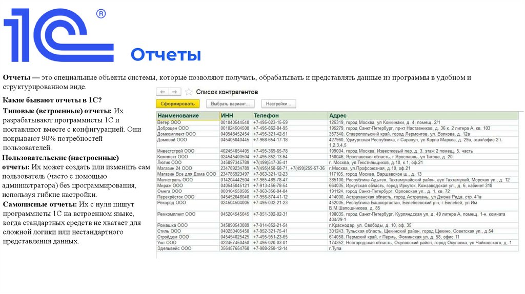 ОтчетыОтчеты — это специальные объекты системы, которые позволяют получать, обрабатывать и представлять данные из программы в удобном и