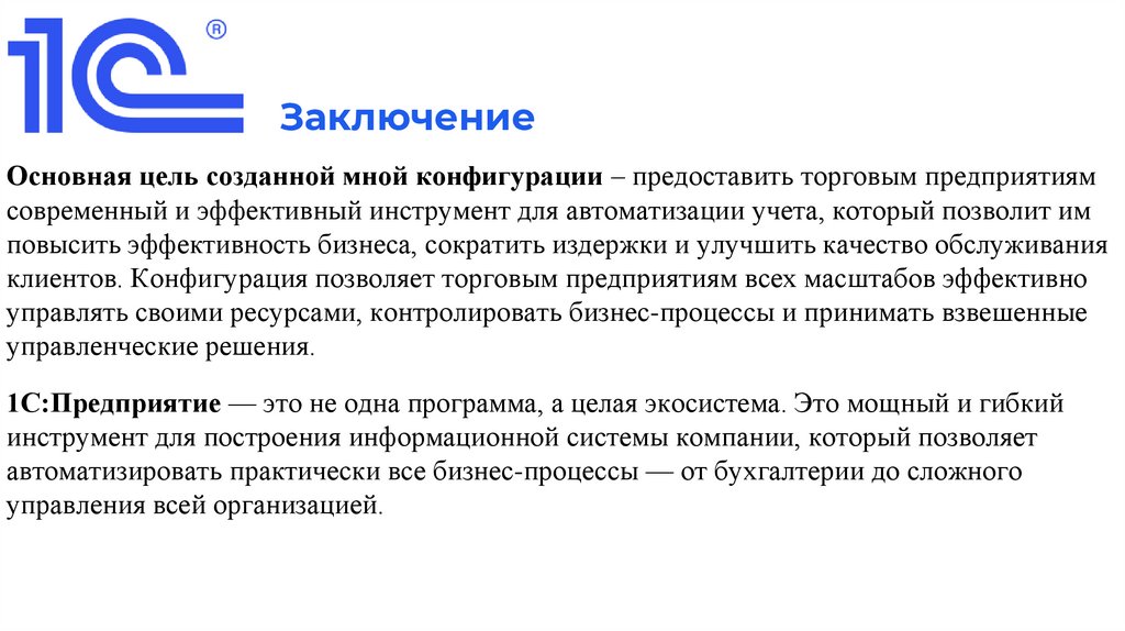 ЗаключениеОсновная цель созданной мной конфигурации – предоставить торговым предприятиям