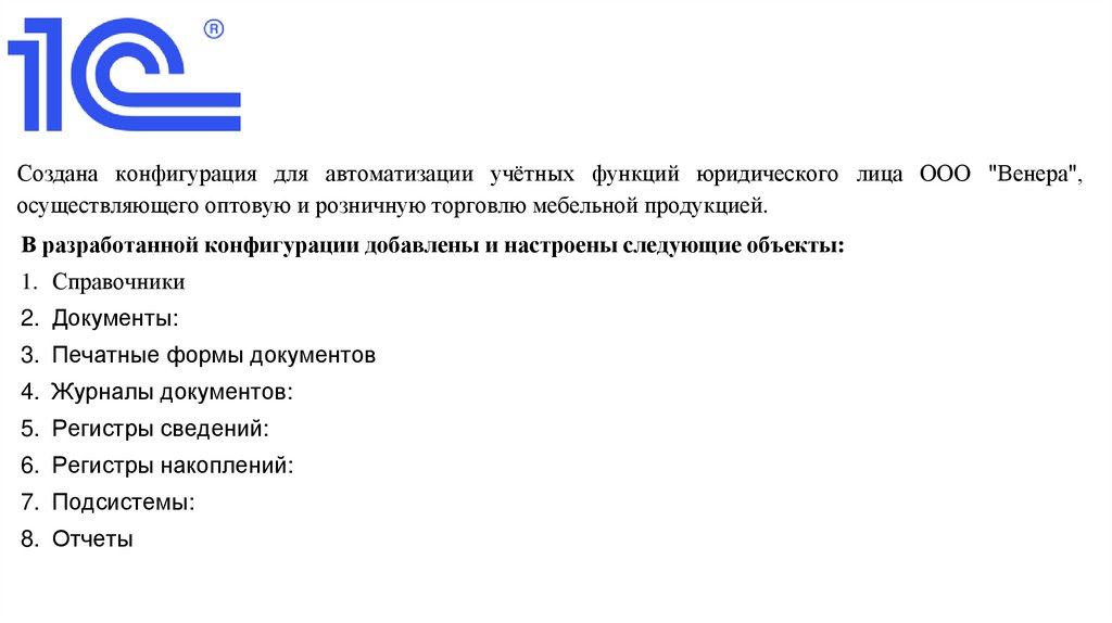 Создана конфигурация для автоматизации учётных функций юридического лица ООО "Венера",осуществляющего оптовую и розничную торговлю мебельной продукцией.