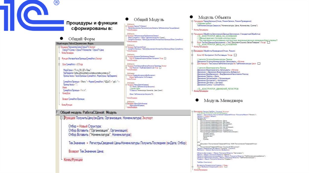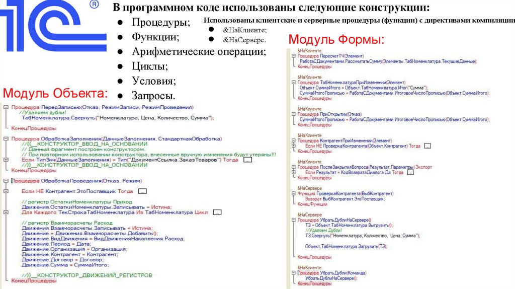 В программном коде использованы следующие конструкции:● Процедуры; Использованы клиентские и серверные процедуры (функции) с директивами компиляции: