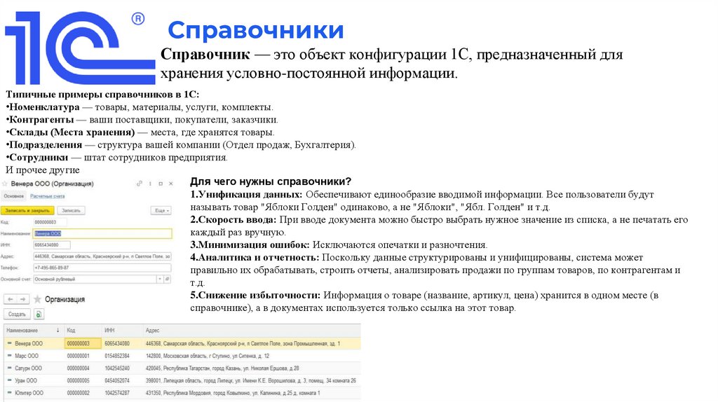 СправочникиСправочник — это объект конфигурации 1С, предназначенный для