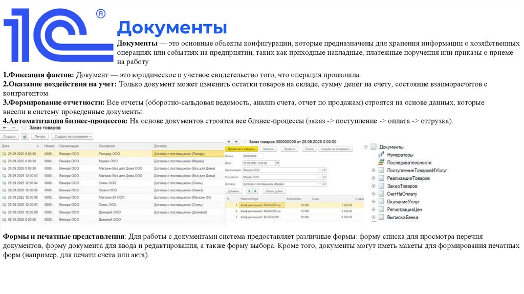 Формы и печатные представления: Для работы с документами система предоставляет различные формы: форму списка для просмотра перечня