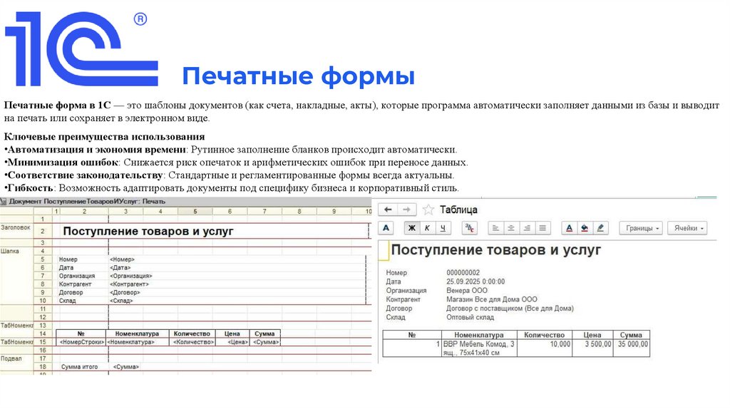 Печатные формыПечатные форма в 1С — это шаблоны документов (как счета, накладные, акты), которые программа автоматически заполняет данными из базы и выводит