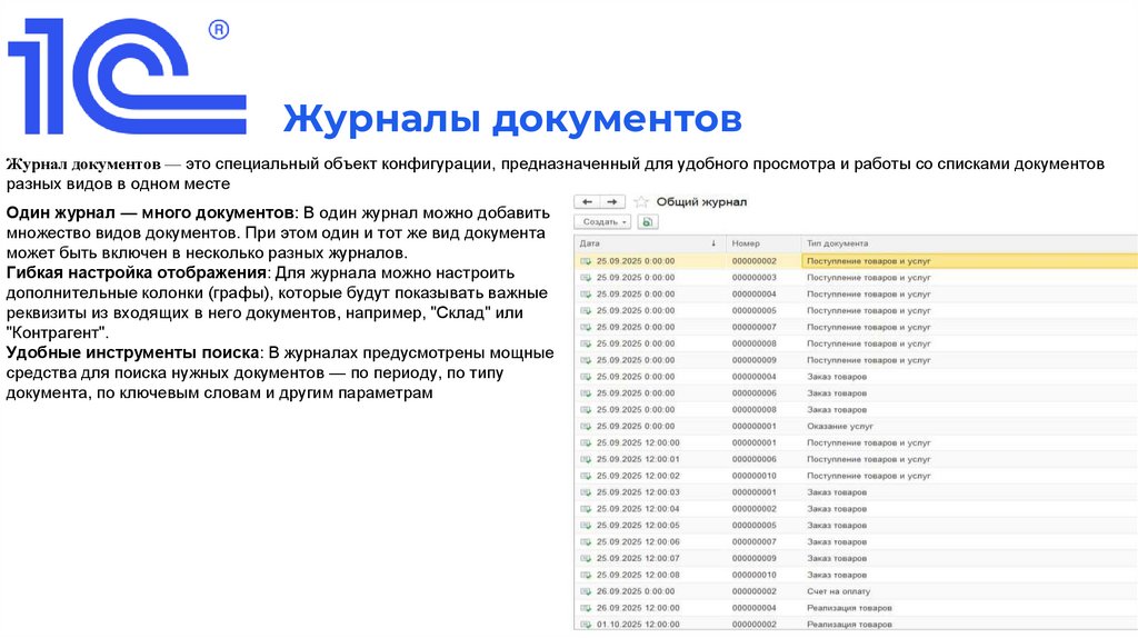 Журналы документовЖурнал документов — это специальный объект конфигурации, предназначенный для удобного просмотра и работы со списками документов