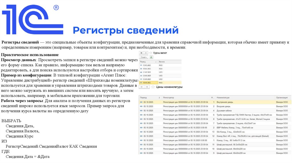 Регистры сведенийРегистры сведений — это специальные объекты конфигурации, предназначенные для хранения справочной информации, которая обычно имеет привязку к
