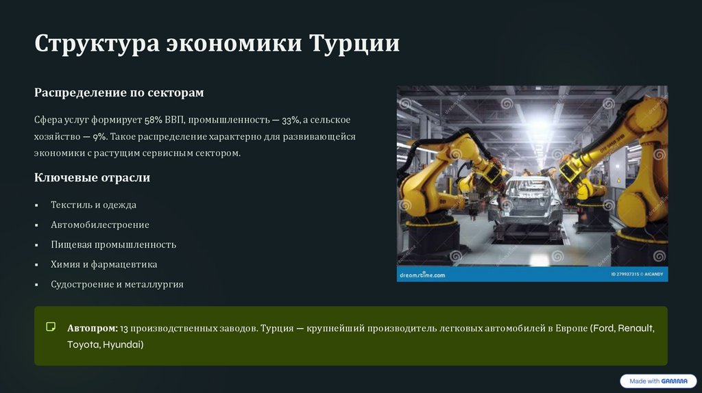 Автопром: 13 производственных заводов. Турция — крупнейший производитель легковых автомобилей в Европе (Ford, Renault,