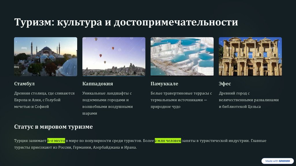 Турция занимает 6-е место в мире по популярности среди туристов. Более 2 млн человек заняты в туристической индустрии. Главные