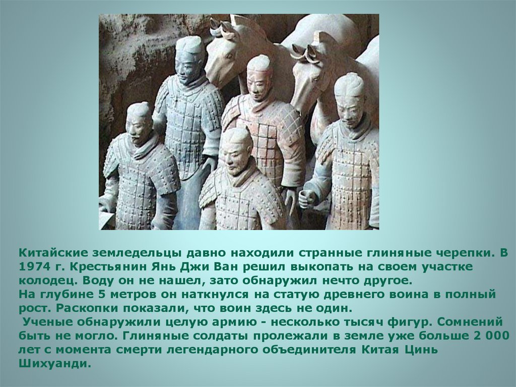 Китайские земледельцы давно находили странные глиняные черепки. В1974 г. Крестьянин Янь Джи Ван решил выкопать на своем участке