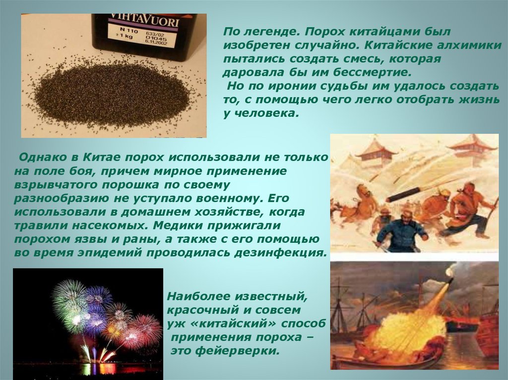По легенде. Порох китайцами былизобретен случайно. Китайские алхимики