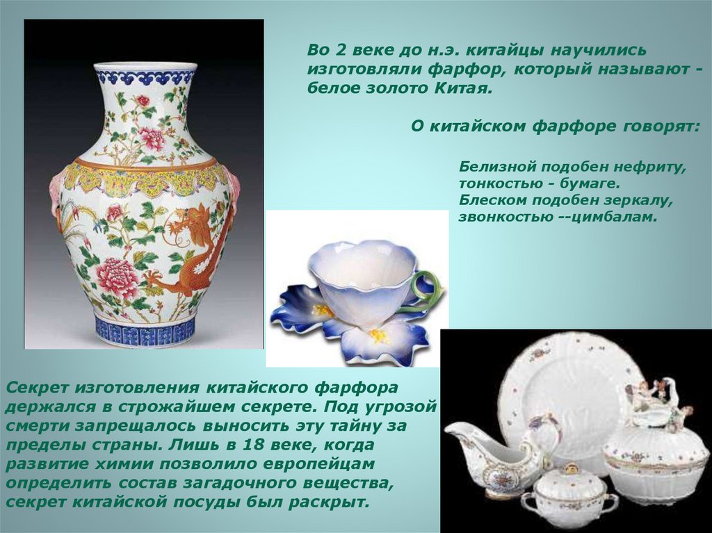 Во 2 веке до н.э. китайцы научилисьизготовляли фарфор, который называют белое золото Китая.