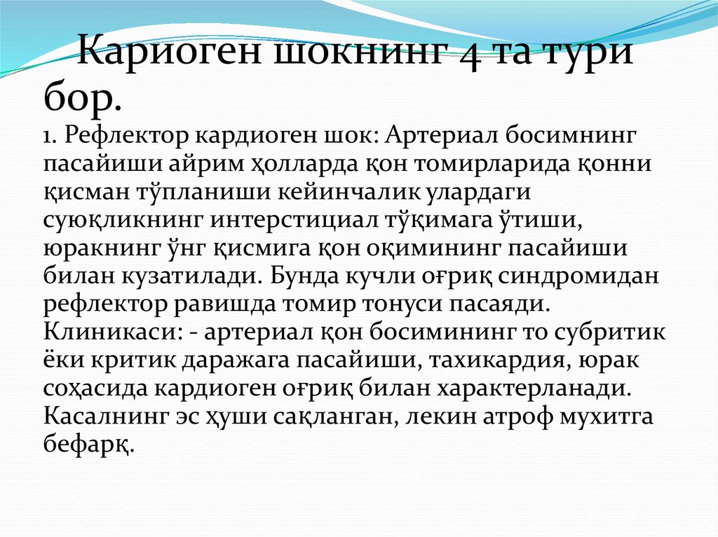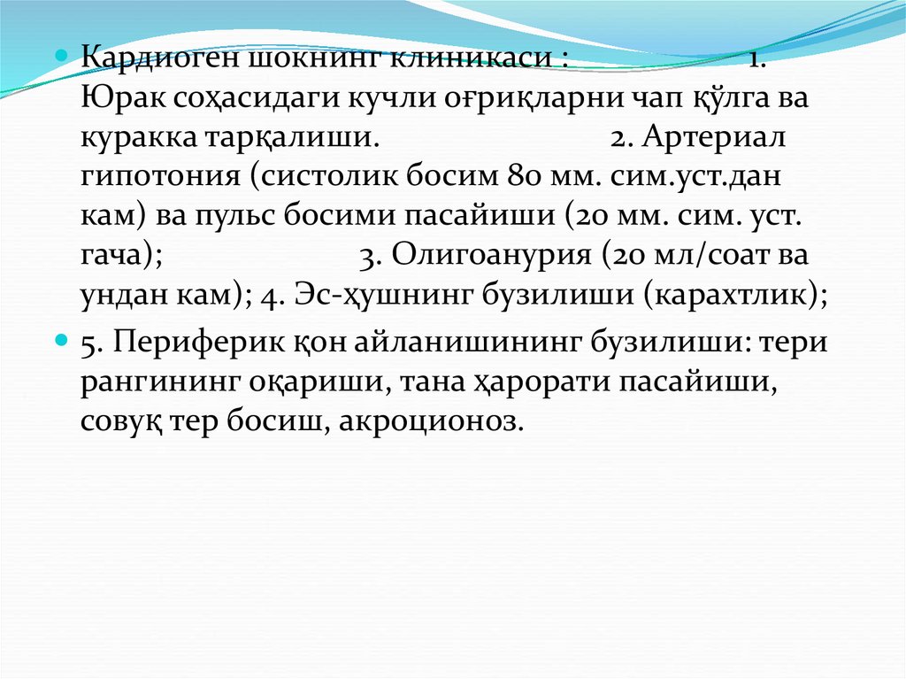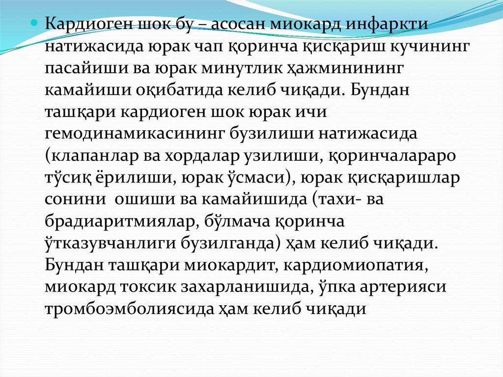 бўлиши билан фарқ қилади. Кардиоген шокнинг бу