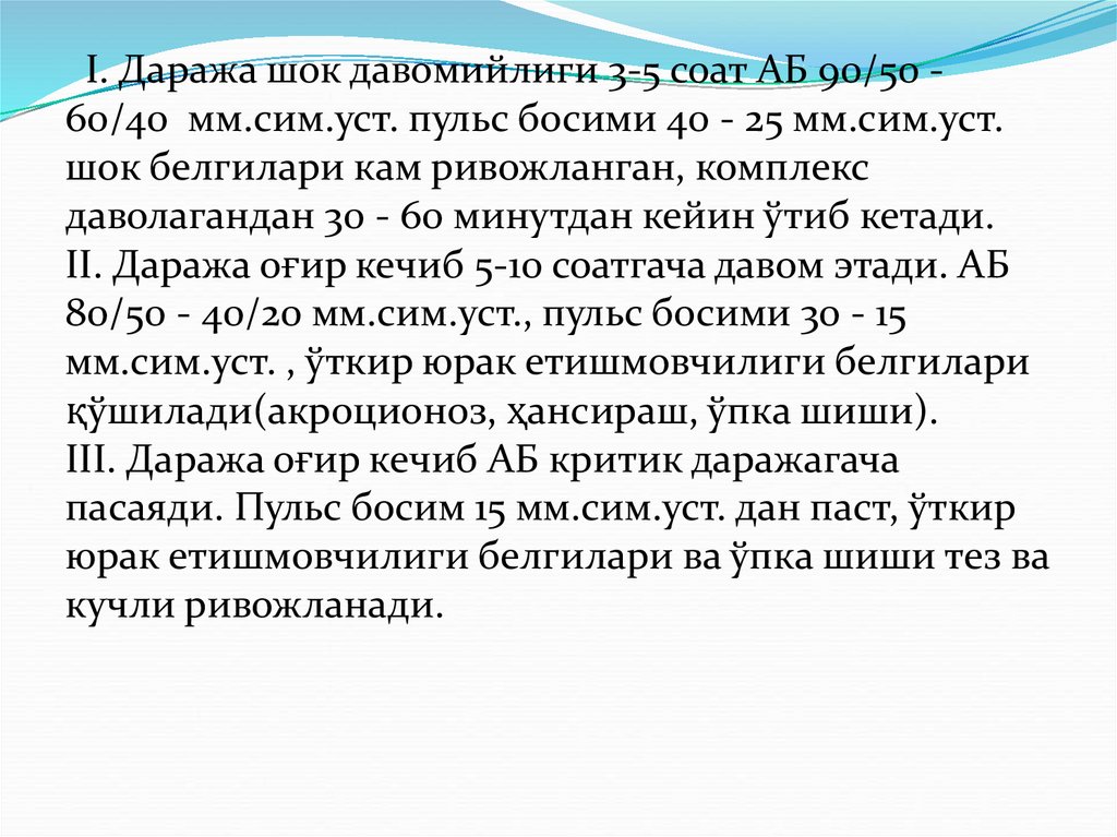 I. Даража шок давомийлиги 3-5 соат АБ 90/50 60/40 мм.сим.уст. пульс босими 40 - 25 мм.сим.уст.шок белгилари кам ривожланган, комплекс